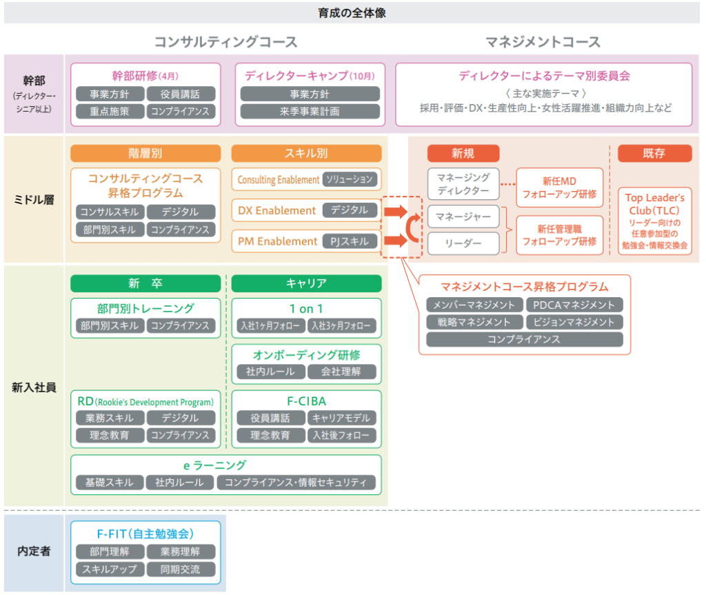 階層別(新入社員・中途社員、ミドル層、幹部向けなど)やスキル別・テーマ別の、さま ざまな研修プログラムを運用し、人財育成を行っています。