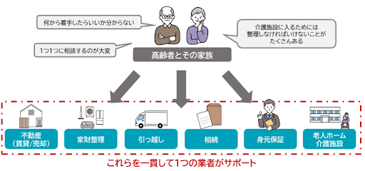 「老人ホームの紹介」を入り口に、「不動産管理」「家財整理」「引っ越し」「相続」「身元保証」まで、全て自社でできるようにする戦略です。