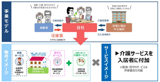 船井総研は、誰も使わず、老朽化が進んでいる空き家(中古物件)(昔の旅館、廃園になった幼稚園、普通の戸建てなど)を、新しい高齢者向けの住まいとして再生させます。